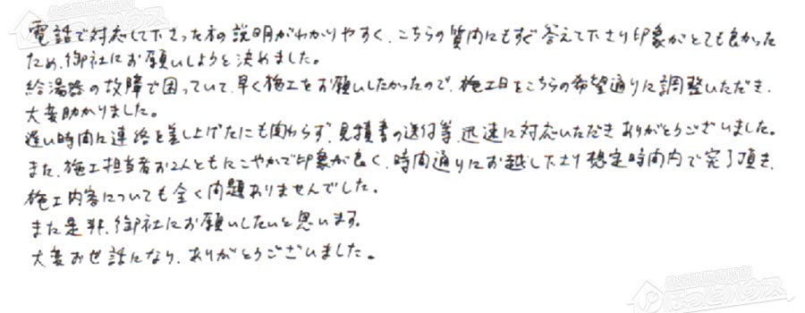給湯器の故障で困っていて、早く施工をお願いしたかったので、施工日をこちらの希望通りに調整いただき、