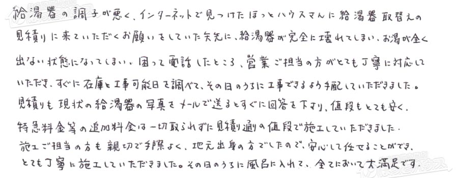 給湯器の調子が悪く、インターネットで見つけたほっとハウスさんに給湯器取替えの