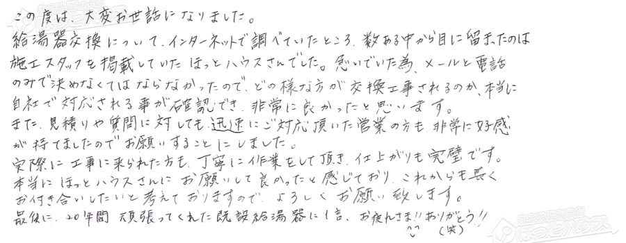最後に、20年頑張ってくれた既設給湯器に1言、お疲れさま!!ありがとう!!