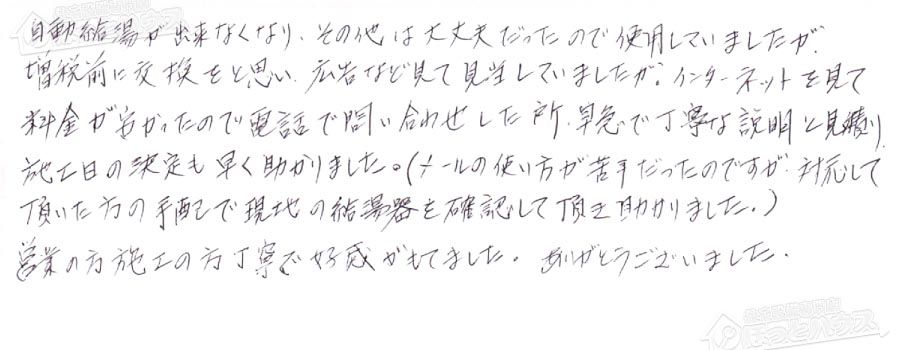 頂いた方の手配で現地の給湯器を確認して頂き助かりました。)
