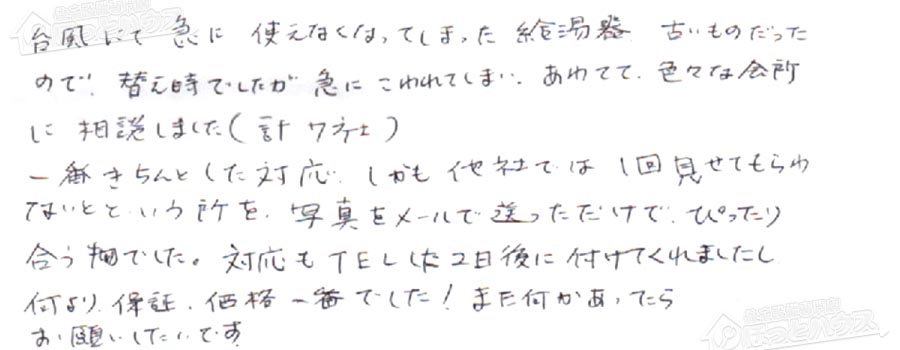 台風にて急に使えなくなってしまった給湯器、古いものだった