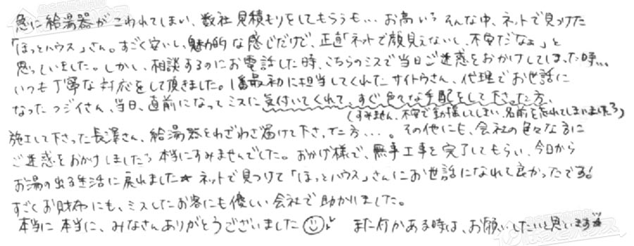 お湯の出る生活に戻れました☆ネットで見つけて「ほっとハウス」さんにお世話になれて良かったです!