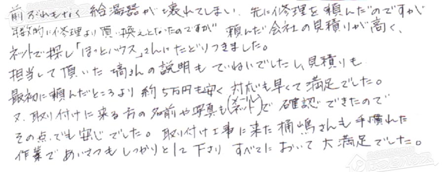 頼んだ会社の見積りが高く、ネットで探し「ほっとハウス」さんにたどりつきま
