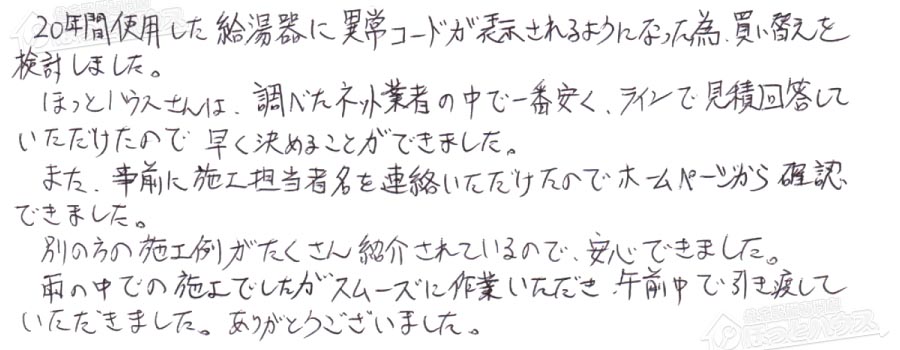 20年間使用した給湯器に異常コードが表示されるようになった為、買い替えを