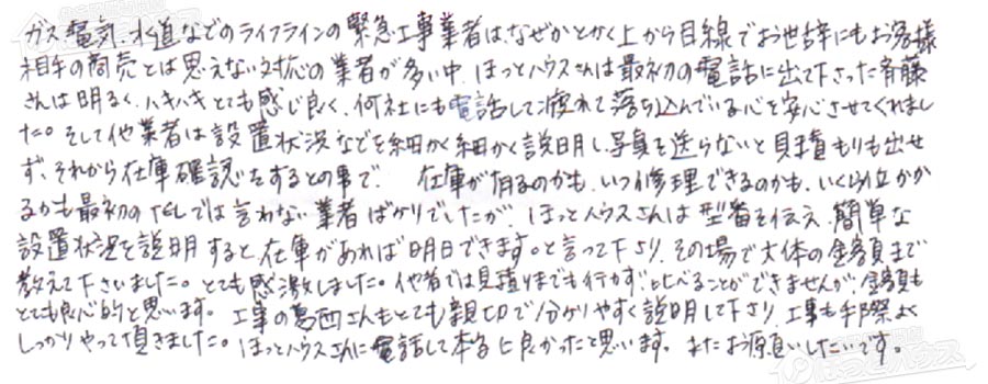 ほっとハウスさんは最初の電話に出て下さった斉藤さんは明るく、ハキハキとても感じ良く、何社にも電話して疲れて落ち込んでいる心を安心させてくれました。そして他業者は設置状況などを細かく説明し写真を送らないと見積もり