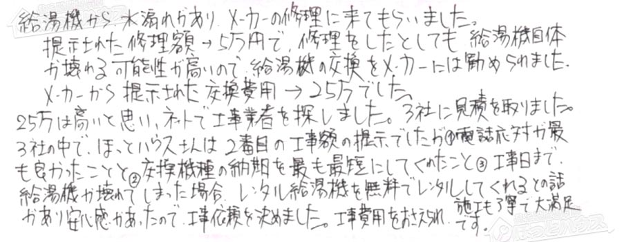 給湯機から、水漏れがあり、メーカーの修理に来てもらいました。