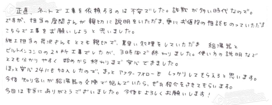 今後知り合いが給湯器の交換で悩んでいたら、ぜひ紹介をさせてもらいます。