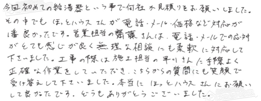 今回初めての給湯器という事で何社か見積りをお願いしました。