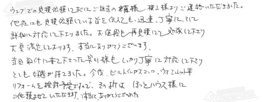 リフォームを検討予定ですので、その折はほっとハウス様にご依頼させていただきます。本当に、ありがとうございました。