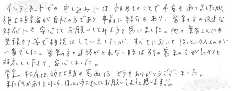 見積り等で相談はしていましたが、すべてにおいて ほっとハウスさんが