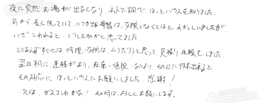 夜に突然お湯が出なくなり、ネットで調べ、ほっとハウスを知りました。