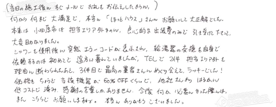 本来は小田原市は担当エリア外なのに、良心的な出張費のみで引き受けて下さって、