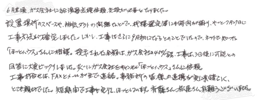 回答に大変ビックリしました。すぐにガス会社をキャンセル「ほっとハウス」さんに依頼。