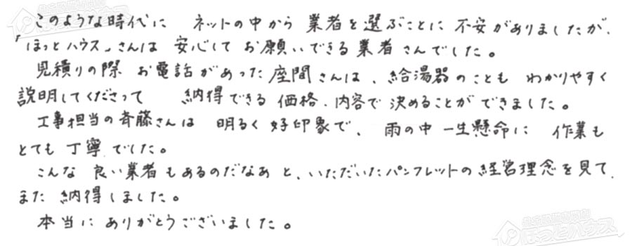 「ほっとハウス」さんは安心してお願いできる業者さんでした。