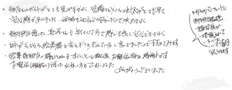 安心感がありました。価格も他社より安かったので決めました。