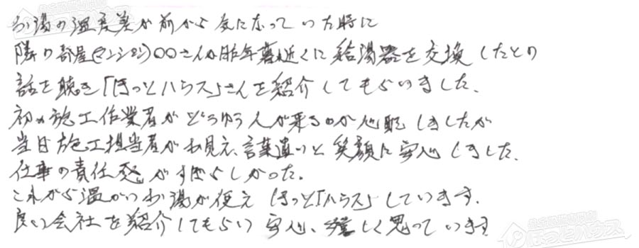 隣の部屋(マンション)〇〇さんが昨年暮れ近くに給湯器を交換したとの