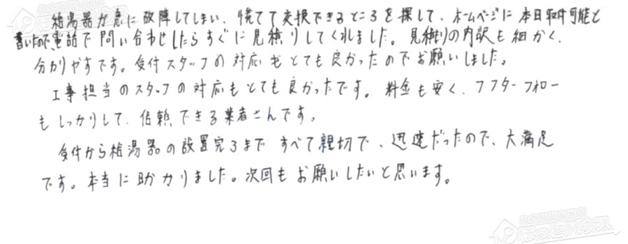 給湯器が急に故障してしまい、慌てて交換できるところを探して、ホームページに本日取付可能と