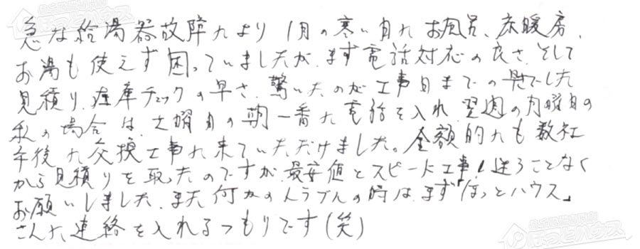 お願いしました。また何かのトラブルの時はまず「ほっとハウス」