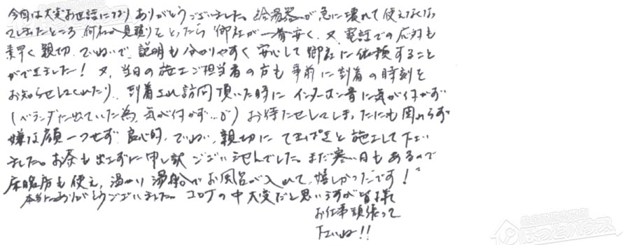 今回はお世話になりありがとうございました。給湯器が急に壊れて使えなくなってしまったところ、何社か見積りをとったら御社が一番安く、又、電話での応対も素早く親切、ていねいで説明も分かりやすく安心して御社に依頼することができました!又、当日の施工ご担当者の方も事前に到着の時刻をお知らせしてくれたり、到着され訪問頂いた時にインターホン音にも気が付かず