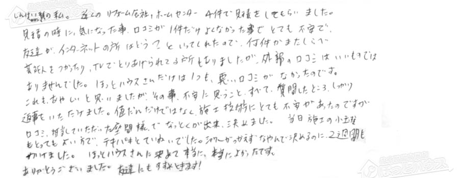 見積の時に、気になった事、口コミが1件だけよくなかった事でとても不安で、