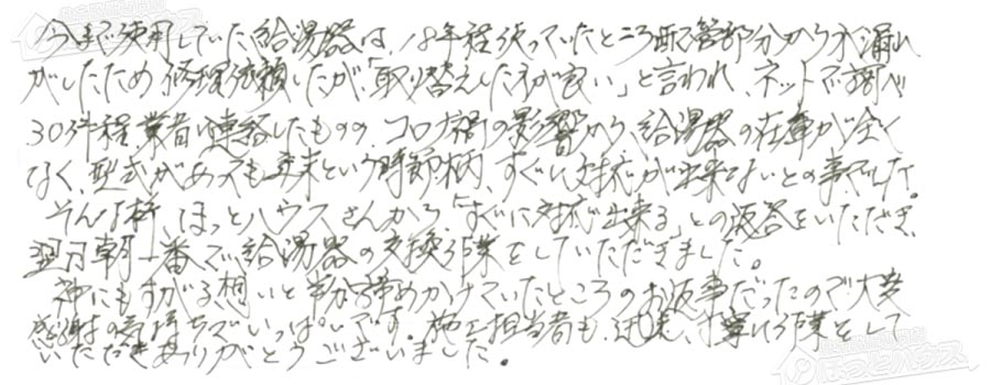 30件程、業者に連絡したものの、コロナ禍の影響から給湯器の在庫が全く