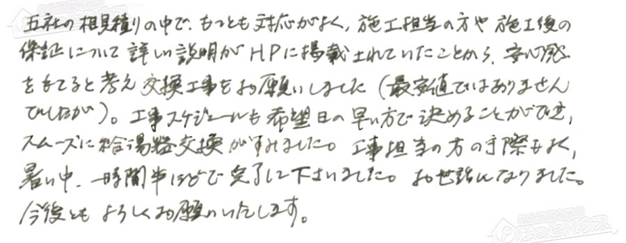 スムーズに給湯器交換がすみました。工事担当の方の手際もよく、