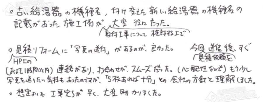 ・HP上の見積りフォームに「写真の送付」があるのが、良かった。今回見積依頼を送信後、すぐ