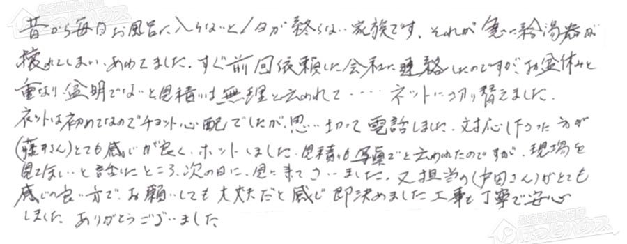 (藤井さん)とても感じが良く、ホットしました。見積りも写真でと云われたのですが、現場を