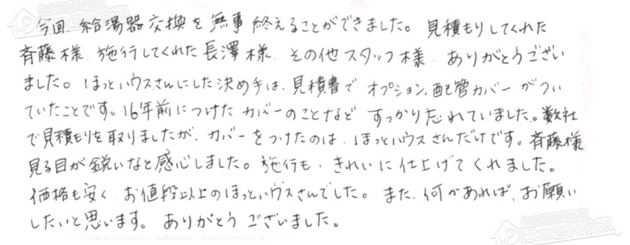 で見積もりを取りましたが、カバーをつけたのは、ほっとハウスさんだけです。斉藤様