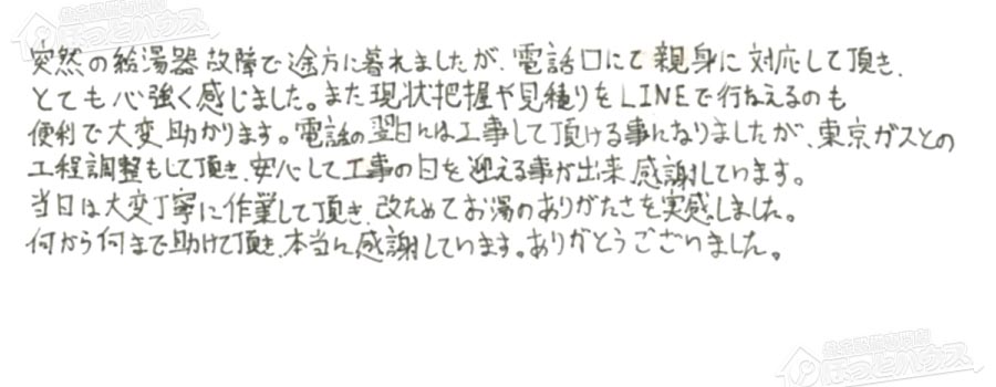 突然の給湯器故障で途方に暮れましたが、電話口にて親身に対応して頂き、