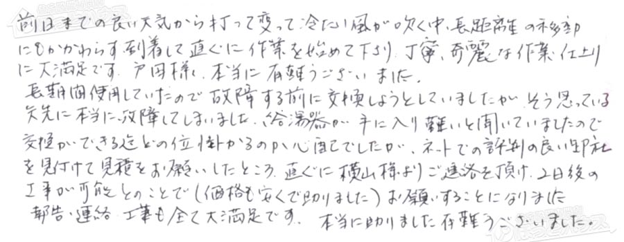 矢先に本当に故障してしまいました。給湯器が手に入り難いと聞いていましたので