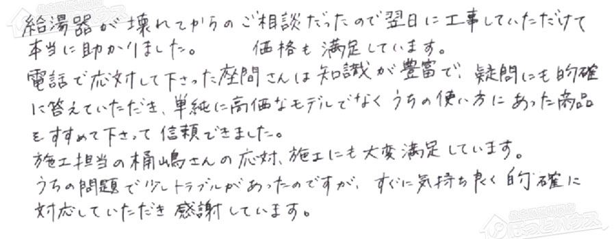 給湯器が壊れてからのご相談だったので翌日に工事していただけて