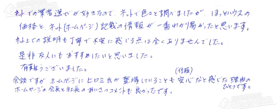 ネットでの業者選びが好きなので、ネットで色々と調べましたが、ほっとハウスの