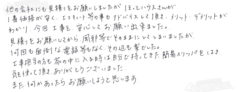 他の会社にも見積りをお願いしましたがほっとハウスさんが