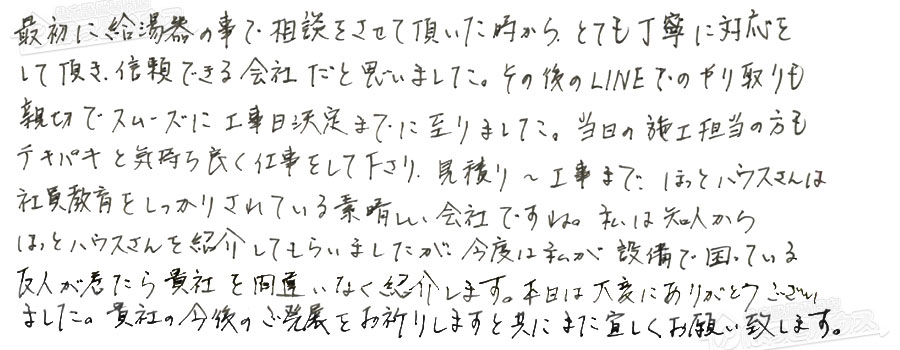 最初に給湯器の事で相談をさせて頂いた時から、とても丁寧に対応を