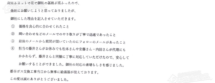 都市ガス交換工事当日から無事に給湯器が使えております。