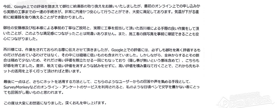 今回、Google上での評価を踏まえて御社に給湯器の取り換えをお願いいたしましたが、最初のオンライン上での申し込みから実際の工事までの一連の手続きが、非常に円滑かつ安心して行うことができ、大変に満足しております。気温が下がる直前に給湯器を取り換えることができ助かりました。