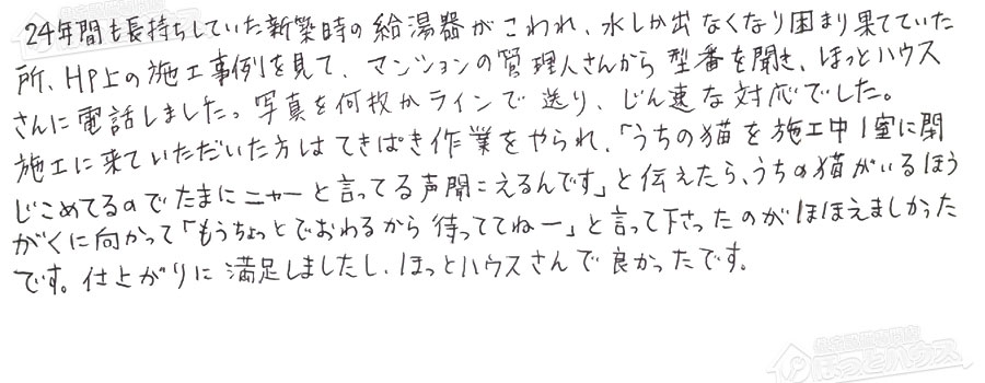 24年間も長持ちしていた新築時の給湯器がこわれ、水しか出なくなり困まり果てていた