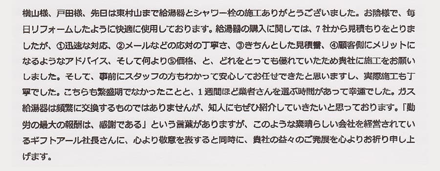と、どれをとっても優れていたため貴社に施工をお願いしました。そして事前にスタッフの方もわかって安心してお任せできたと思いますし、実際施工も丁寧でした。こちらも繁盛期でなかったことと、1週間ほど業者さんを選ぶ時間があって幸運でした。ガス給湯器は頻繁に交換するもではありませんが、知人にぜひ紹介していきたいと思っております。『勤労の最大の報酬は、感謝である』と言う言葉がありますが、このような素晴らしい会社を経営されているギフトアール社長さんに、心より敬意を表すると同時に、貴社の益々のご発展を心よりお祈り申し上げます。