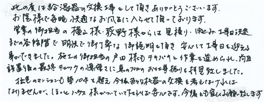 此の度は給湯器の交換工事をして頂きありがとうございます。