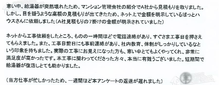寒い中、給湯器が突然壊れたため、マンション管理会社の紹介でA社から見積もりを取りました。