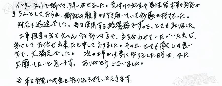 対応も迅速でした。毎日使用する給湯器ですので、とても助かりました。