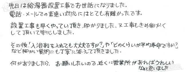 設置工事も早くやってい頂き、助かりました。又工事もきめ細かくして頂いて