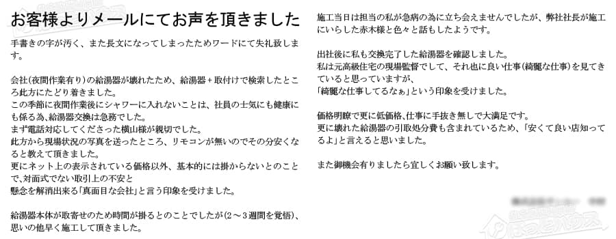 会社(夜間作業有り)の給湯器が壊れたため、給湯器+取付けで検索したところ