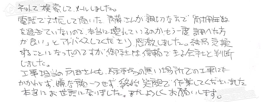 結局交換する事になったのですが、御社は信頼できる会社と判断しました。
