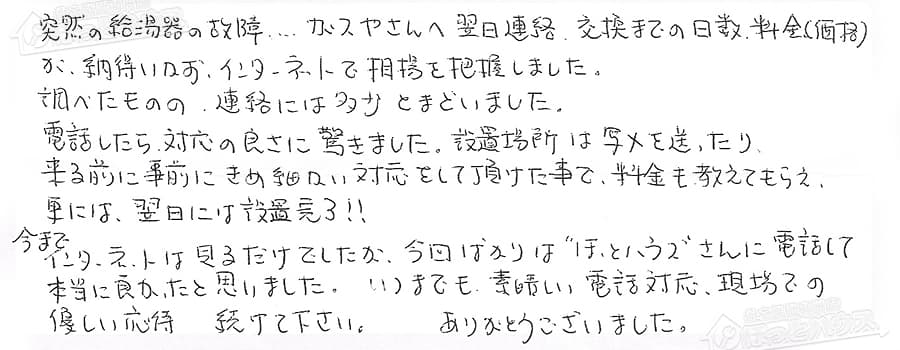 今まで、インターネットは見るだけでしたが、今回ばかりは”ほっとハウス”さんに電話して本当に良かったと思いました。いつまでも素晴しい電話対応、