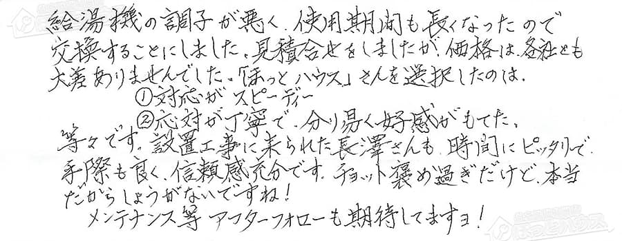 等々です。設置工事に来られた長澤さんも時間にピッタリで、手際も良く、信頼感充分です。チョット褒め過ぎだけど、本当だからしょうがないですね!