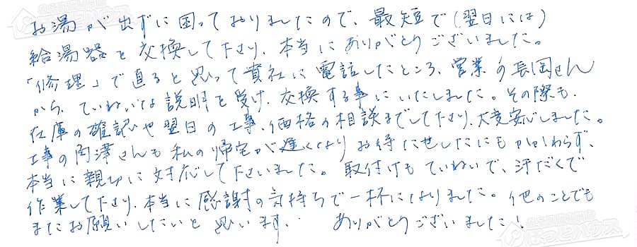 給湯器を交換して下さり、本当にありがとうございました。