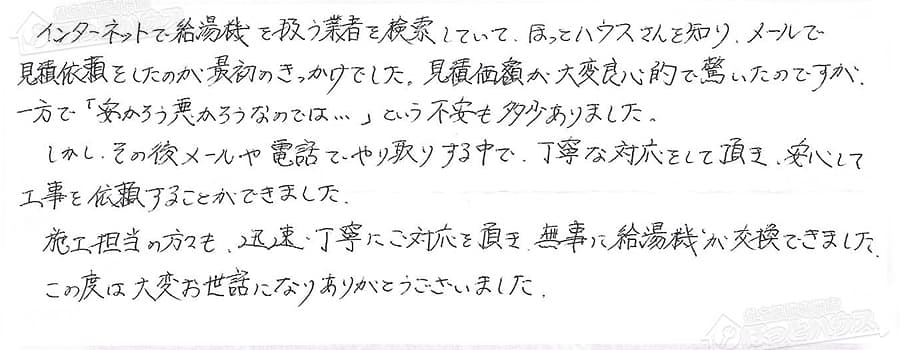 インターネットで給湯機を扱う業者を検索していて、ほっとハウスさんを知り、メールで見積依頼をしたのが最初のきっかけでした。