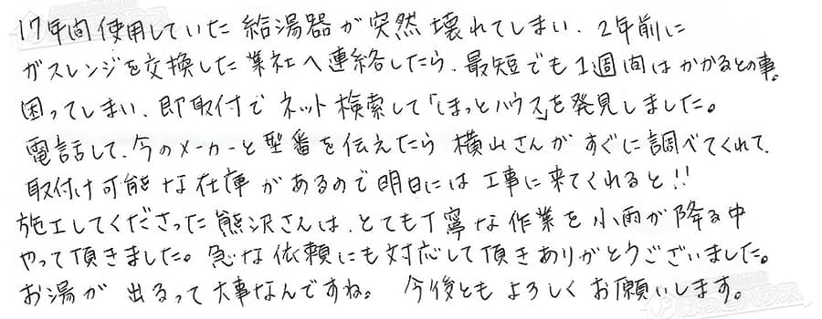 17年間使用していた給湯器が突然壊れてしまい、2年前にガスレンジを交換した業社へ連絡したら、最短でも1週間はかかるとの事。